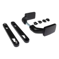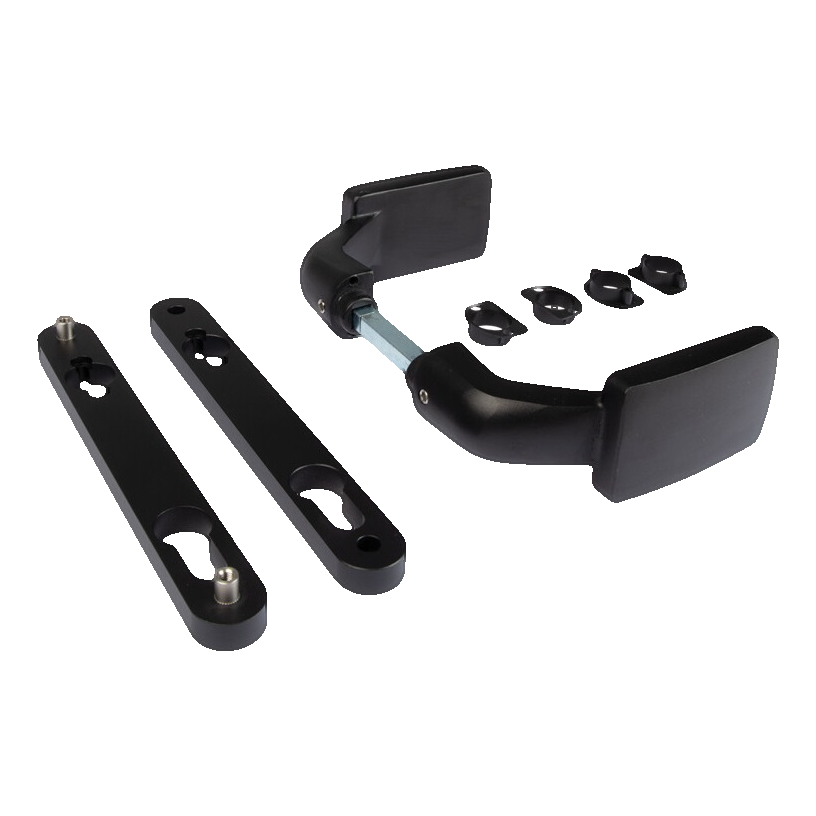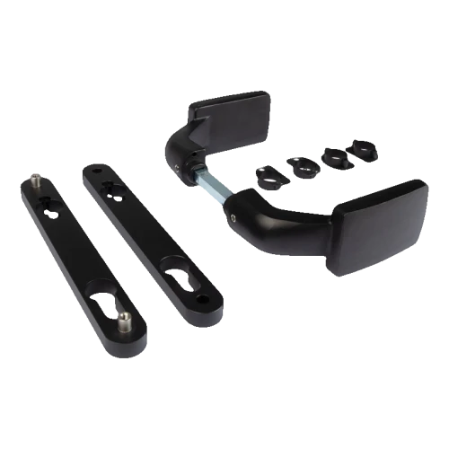 Az ergonomikus fogantyú kifejezetten úgy lett tervezve, hogy megakadályozza a kéz horzsolódását az oszlopon lévő támasztólemezen — ez fontos előny intenzív használat esetén kereskedelmi és ipari objektumoknál. A készletben két szerelőpajzs, egy pár kilincs, összekötő tengely és rögzítőcsavarok pillangóanyákkal találhatók, ami gyors és problémamentes szerelést biztosít.