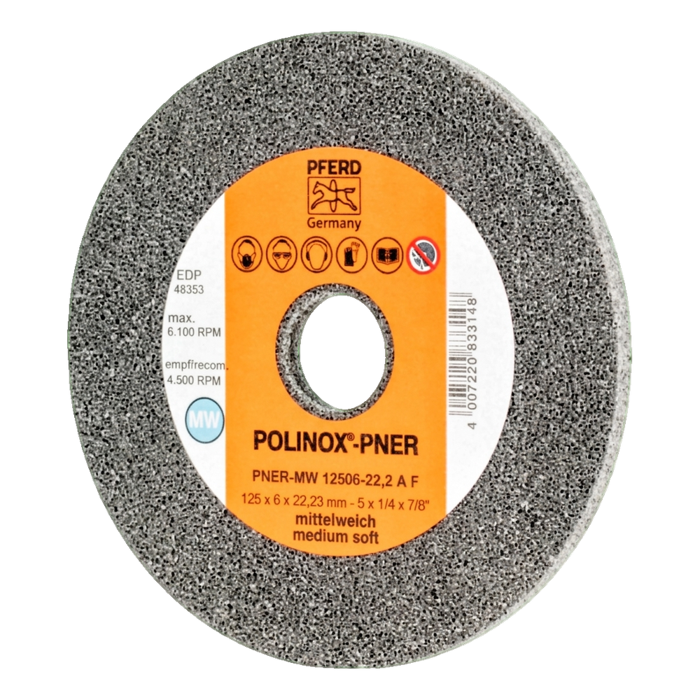 A PFERD POLINOX®-PNER egy kompakt, préselt csiszolószövetből készült csiszolótárcsa, amely precíz felületfinishingre lett tervezve változtatható fordulatszámú sarokcsiszolókon. A közepesen lágy szerkezetnek (MW) és a finom korund szemcséknek (A F) köszönhetően kiválóan alkalmas szatinálásra, mattításra, tisztításra és finom sorják eltávolítására — rozsdamentes acélon és túlmelegedésre érzékeny anyagokon is.