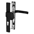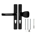 Fekete kilincskészlet gombbal pajzson PSG egy komplett ajtóvasalat készlet bejárati ajtókhoz, kapukhoz és kerítéskapukhoz, amelyek cilinderbetétes zárral vannak felszerelve. A kilincs + gomb megoldás kényelmes kezelést biztosít belső oldalról (kilincs) és biztonságos zárást külső oldalról (gomb csak kulccsal forgatható). A téglalap alakú takarórózsa hatékonyan elfedi a szerelőcsavarokat, esztétikus, modern megjelenést kölcsönözve az ajtónak.