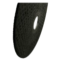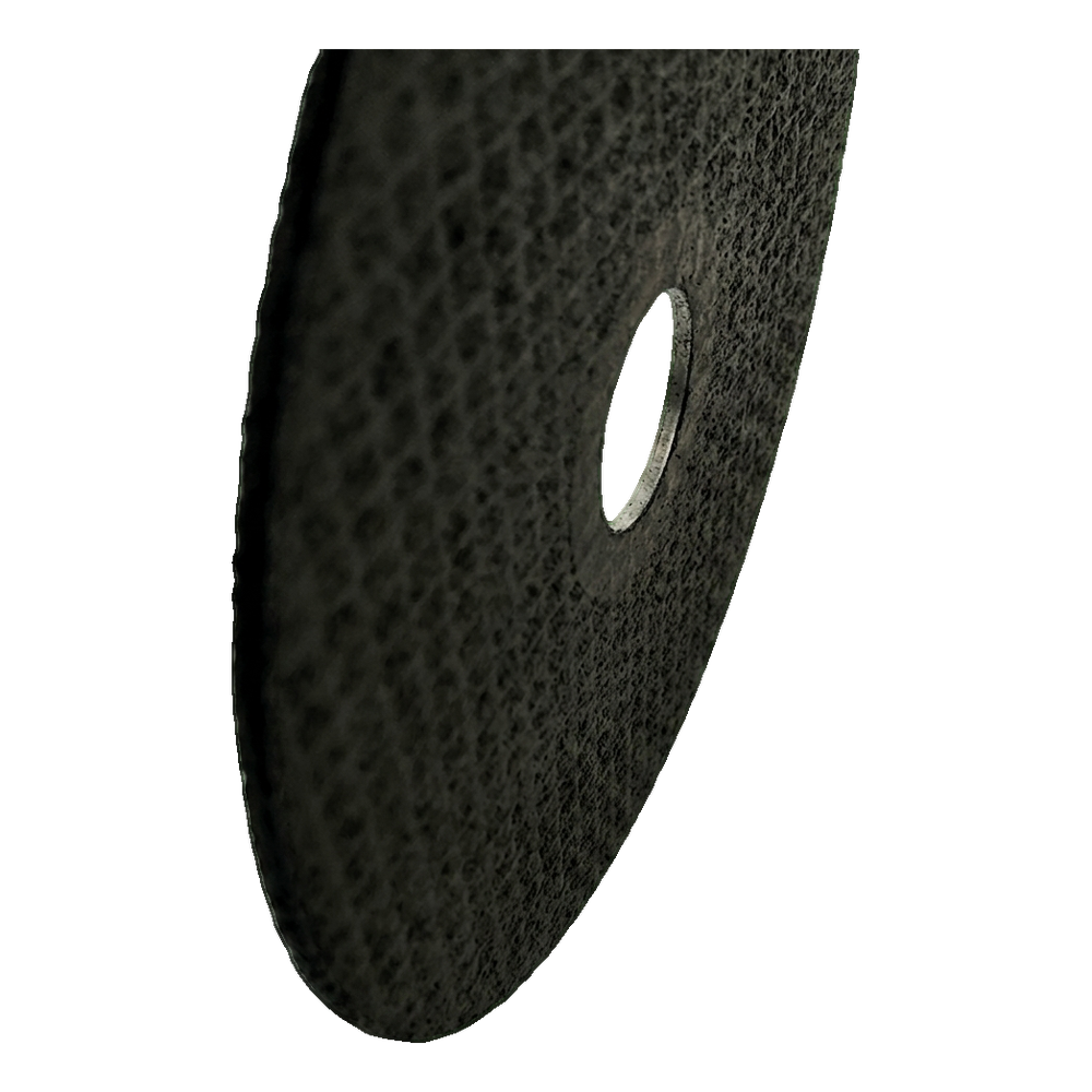 A tárcsa szálhálós erősítéssel rendelkezik, amely a hátoldalon látható, ez megakadályozza a tárcsa szétesését nagy fordulatokon és biztonságos használatot biztosít még intenzív oldalsó terhelés esetén is. A szintetikus gyanta kötőanyag ellenállóságot biztosít a vágás során keletkező magas hőmérséklettel szemben, a korund csiszolószemcsék pedig önmaguk tárják fel magukat a kopás során — állandó vágási agresszivitást fenntartva a teljes használati időszak alatt.