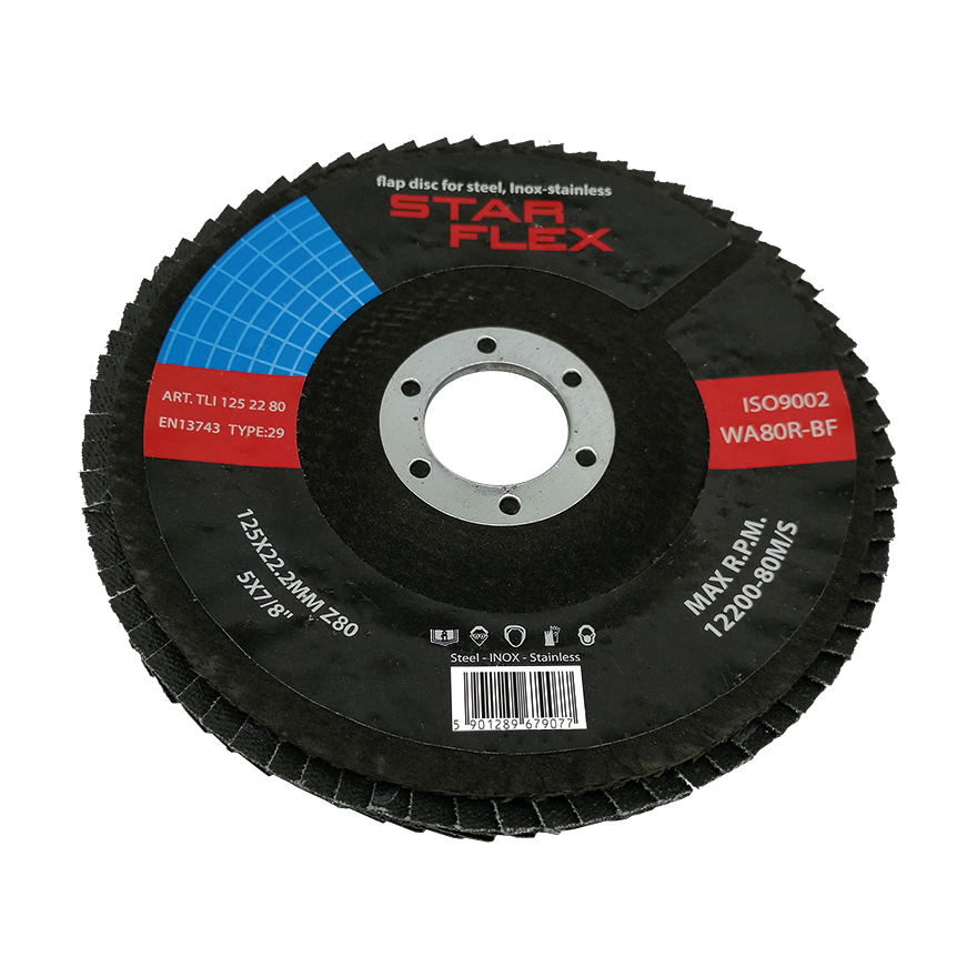 Starflex lamellás korong T29 125 mm 80-as granulátummal egy kiváló minőségű lamellás csiszolókorong cirkónium bevonattal, amelyet rozsdamentes acél (INOX) és szénacél professzionális megmunkálására terveztek. A hajlított kivitel (29-es típus) precíz munkát tesz lehetővé éleken, sarkokon és hegesztési varratokon — mindenhol, ahol a szög kontrollja és az anyageltávolítás hatékonysága számít.
