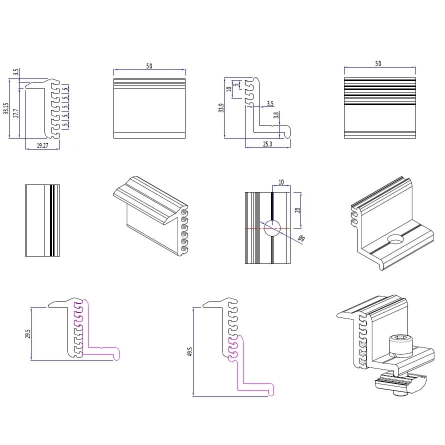 Oldalsó bilincs alumínium 6060 eloxált, állítható a csúszó hornyoknak köszönhetően, 30-50 mm-es fotovoltaikus modulok rögzítéséhez.
